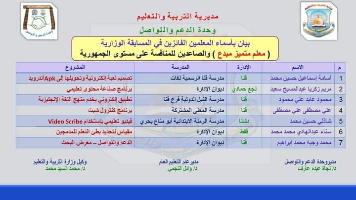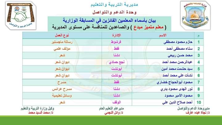 أعلنت وحدة التواصل ودعم المعلمين بمديرية التربية والتعليم بقنا، نتيجة المسابقة السنوية (معلم مبدع متميز)  وفقا لتوجيهات الدكتور رضا حجازي وزير التربيه والتعليم الدكتور، وتحت رعاية الدكتور محمد السيد وكيل وزارة التربية والتعليم بقنا وبإشراف الدكتور وائل سيد مدير عام التعليم العام والدكتورة نجاة عبده مدير وحدة الدعم والتواصل بقنا.