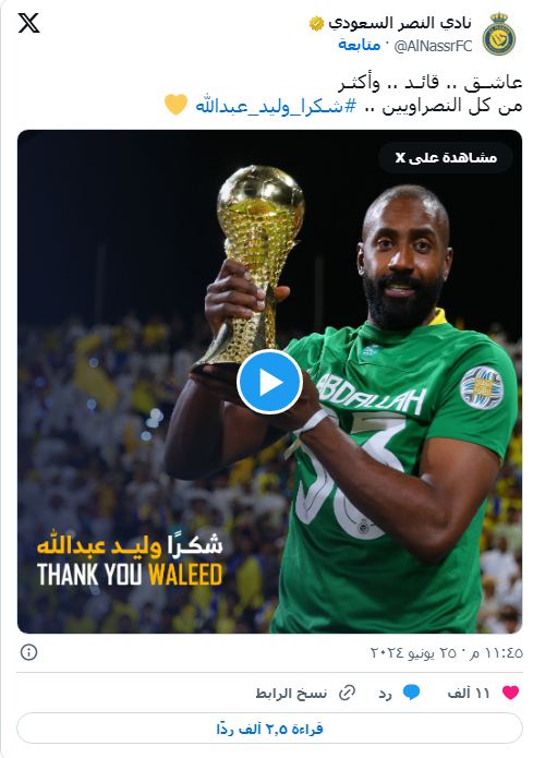 وكتب الحساب الرسمي لنادي النصر، عبر شبكة التواصل الاجتماعي «X»: "عاشـق، قائـد، وأكثـر، من كل النصراويين، شكرا وليد عبدالله".
