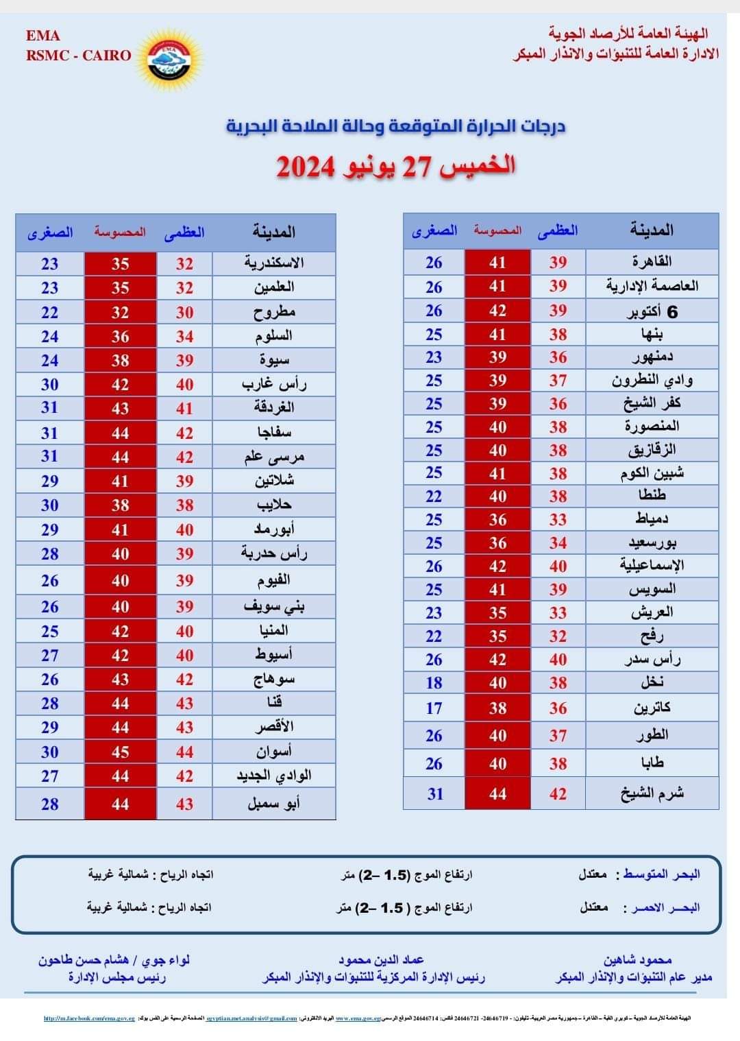 يشهد اليوم الخميس الموافق 27 يونيو، طقس شديد الحرارة رطب في فترة النهار على أغلب مناطق الجمهورية، ويكون حار رطب على السواحل الشمالية، مائل للحرارة رطب في فترة الليل على أغلب الأنحاء ومعتدل الحرارة رطب ليلا على السواحل الشمالية.