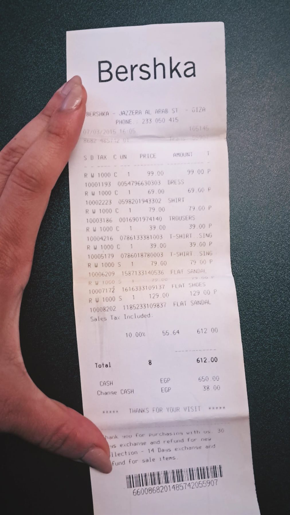 تفاجئ رواد موقع فيسبوك بحساب يدعي نريمان العامري، صورة فاتورة من الماركة العالمية بيرشكا، وكتبت :" بردية من محل bershka سنة 2015 فستان و 3 تيشرتات و بنطلون و صندلين و جزمة فلات بـ 612 جنيه"، مما جعل الجماهير يعلقون على الأمر وسط صدمة كبيرة من سعر ملابس الماركة التي وصلت الأن.