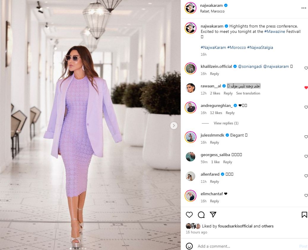 وتفاعل متابعيها مع إطلالتها وجاءت أبرز التعليقات مؤيدة لها، رصدنا أبرزها: " احلى وحده تلبس موڤ، واو الالوان الي عم تختاريها خيال الخوخي سحرني وهلق هذا اللون عليكي يجنن الله يحميكي ما اجملك، تعال قلبي".