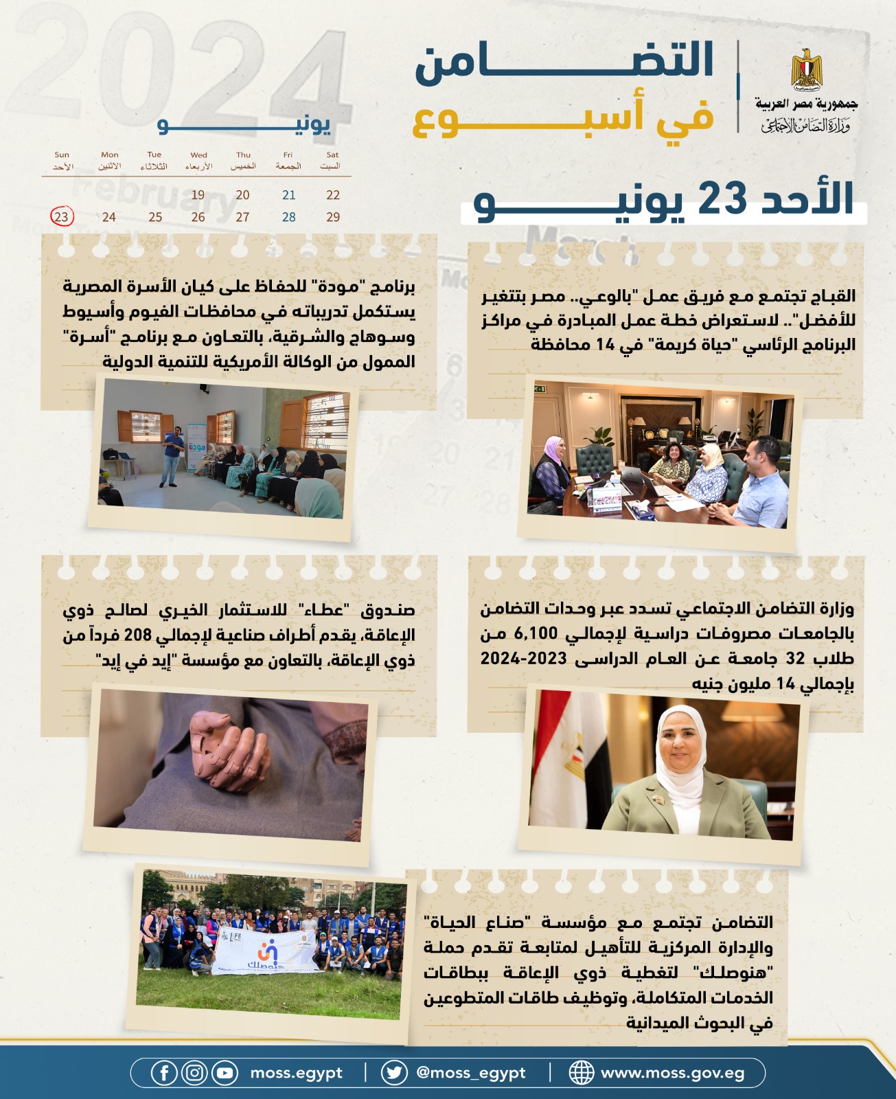 أصدرت وزارة التضامن الاجتماعي تقريرها الأسبوعي بالإنفوجراف والفيديو، حيث تستعرض من خلاله الأنشطة والأحداث، التي قامت بها السيدة نيفين القباج وزيرة التضامن الاجتماعي، وكذلك قطاعات الوزارة المختلفة خلال الفترة من من 21 يونيو إلى 27 يونيو 2024، ونستعرض أبرزها في التقرير التالي: