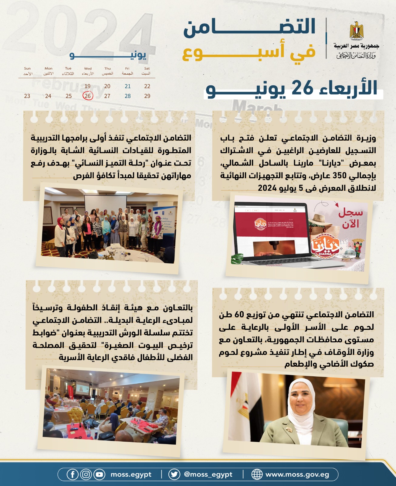 - وزيرة التضامن الاجتماعي تعلن فتح باب التسجيل للعارضين الراغبين في الاشتراك بمعرض "ديارنا"مارينا بالساحل الشمالي، بإجمالي 350 عارضا، وتتابع التجهيزات النهائية لانطلاق المعرض فى 5 يوليو 2024.