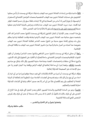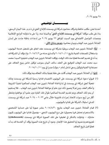 وأكملت الشركة :"الفنانة شيرين عبد الوهاب يربطها بشركة ذي بيسمنت عقد اتفاق على تشغيل خدمة اليوتيوب واستغلال المصنفات الفنية بتاريخ 2018/10/11 والساري مدته من 2018/09/2، وإذ تؤكد أن الشركة قد بدأت في تقديم الخدمة فعلياً منذ ذلك الوقت، ووكلت الفنانة شيرين عبد الوهاب شقيقها محمد عبد الوهاب للتوقيع على العقد سالف البيان بموجب توكيل خاص يبيح التعاقد على مصنفاتها الفنية وتوكيل رسمي شامل عام + بنوك صدرا في يوم 2018/10/11".