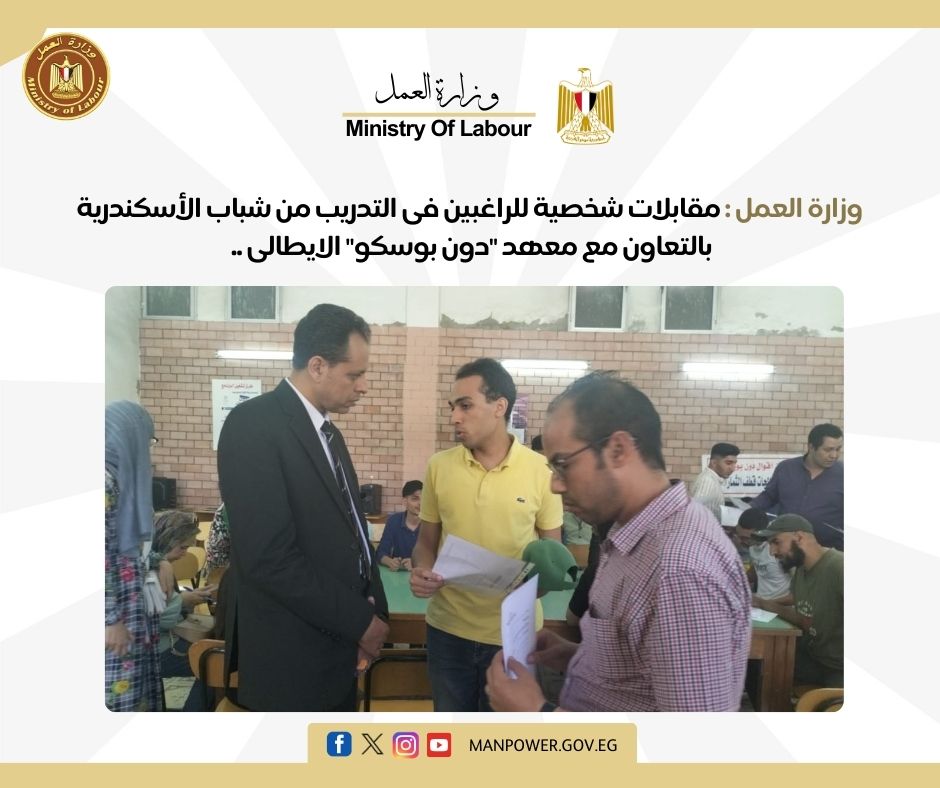 وذلك بمعهد الساليزيان الدون بوسكو فرع الأسكندرية، فى إطار تنفيذ بروتوكول التعاون الموقع بين وزارة العمل والمعهد الإيطالي، بهدف تدريب الشباب على مهن جديدة ومتطورة تتناسب مع سوق العمل الداخلى والخارجى.