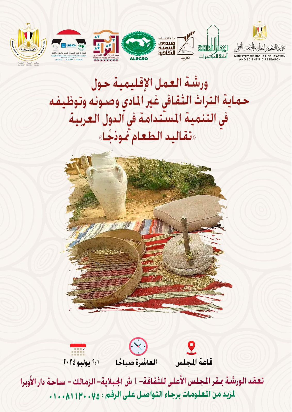 تحت رعاية الدكتورة نيفين الكيلاني، وزيرة الثقافة، والدكتور أيمن عاشور، وزير التعليم العالي والبحث العلمي، تقيم اللجنة الوطنية المصرية للتربية والعلوم والثقافة، بالتعاون مع المنظمة العربية للتربية والثقافة والعلوم المصرية، ورشة عمل بعنوان "حماية التراث الثقافي غير المادي وصونه وتوظيفه في التنمية المستدامة في الدول العربية… تقاليد الطعام نموذجًا"، وذلك يومي الإثنين والثلاثاء 1 و 2 يوليو 2024، العاشرة صباحًا، بالمجلس الأعلى للثقافة، وذلك بمشاركة نُخبة من الخبراء والمتخصصين في مجال "صون التراث غير المادي".