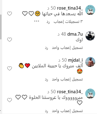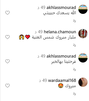 وجاءت التعليقات كالآتي: "الله يسعدها في حياتها"، "ألف مبروك يا حبيبة الملايين"، "مبروووووك يا عروستنا الحلوة"، "أطيب قلب بالدنيا ، الله يهنيها في حياتها"، "مبرووك نجوي بتستاهلي كل خير"، " مليار مبروك شمس الغنية"، " بس مين العريس لنفهم يعني".