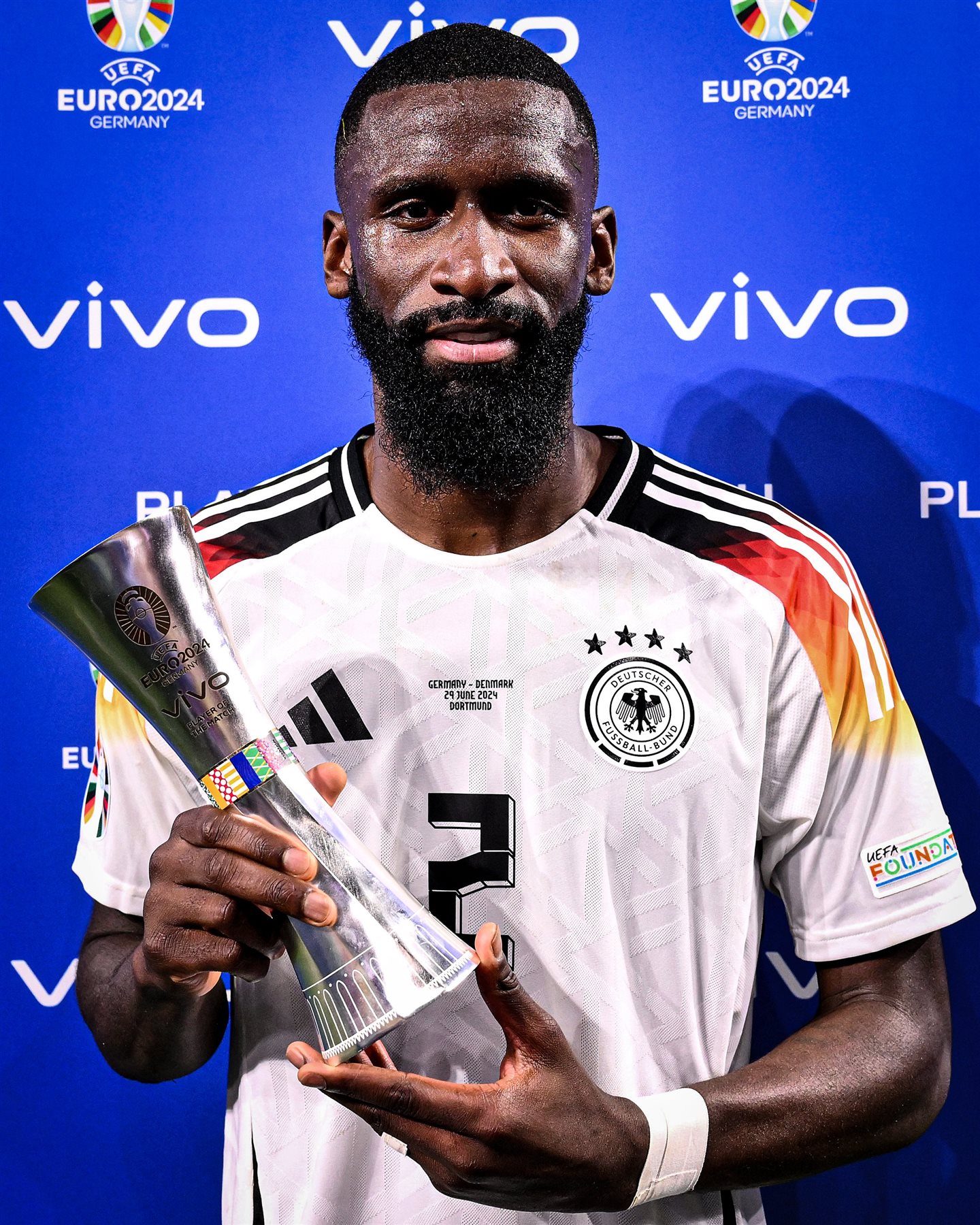 فاز أنطونيو روديجر مدافع منتخب ألمانيا بجائزة الأفضل في مباراة الدنمارك التي جمعت بينهما مساء أمس السبت في دور الستة عشر من بطولة كأس أمم أوروبا، على ملعب سيجنال ايدونا بارك.