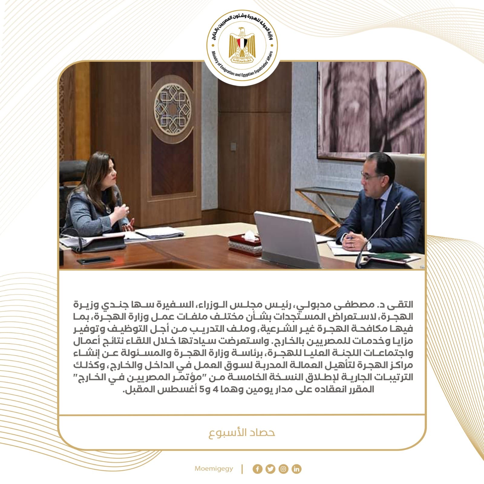 1- التقى د. مصطفى مدبولي، رئيس مجلس الوزراء، السفيرة سها جندي وزيرة الهجرة، لاستعراض المستجدات بشأن مختلف ملفات عمل وزارة الهجرة، بما فيها مكافحة الهجرة غير الشرعية، وملف التدريب من أجل التوظيف وتوفير مزايا وخدمات للمصريين بالخارج. واستعرضت سيادتها خلال اللقاء نتائج أعمال واجتماعات اللجنة العليا للهجرة، برئاسة وزارة الهجرة والمسئولة عن إنشاء مراكز الهجرة لتأهيل العمالة المدربة لسوق العمل في الداخل والخارج، وكذلك الترتيبات الجارية لإطلاق النسخة الخامسة من "مؤتمر المصريين في الخارج" المقرر انعقاده على مدار يومين وهما 4 و5 أغسطس المقبل.