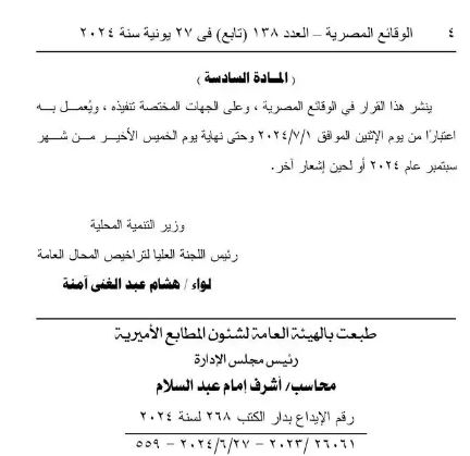ونص القرار على أن ينشر هذا القرار في الوقائع المصرية، وعلى الجهات المختصة تنفيذه، ويعمل به اعتبارا من يوم الإثنين الموافق ٢٠٢٤/٧/١ وحتى نهاية يوم الخميس الأخير من شهر سبتمبر عام ٢٠٢٤ أو لحين إشعار آخر.