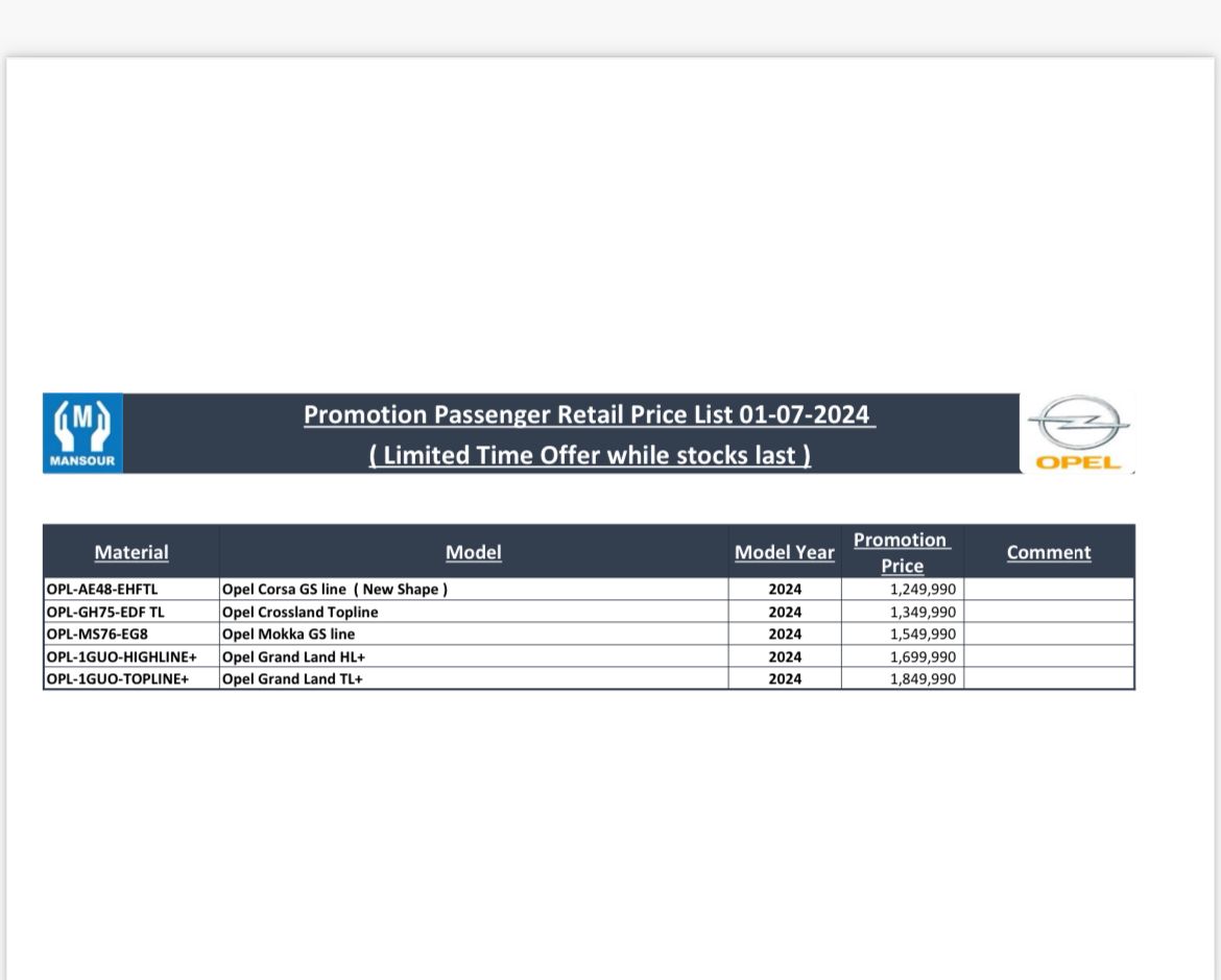 بحسب “المنصور للسيارات”،  سيتم تقديم السيارة أوبل كورسا داخل العرض الجديد بسعر 1,249,990 جنيه، والسيارة أوبل كروس لاند بسعر 1,349,990 جنيه، ويصل سعر أوبل موكا داخل الحملة إلى 1,549,990 جنيه، وأوبل جراند لاند هاي لاين بلس بسعر1,699,990 جنيه، بينما يبلغ سعر السيارة أوبل جراند لاند التوب لاين بلس1,849,990 جنيه.
