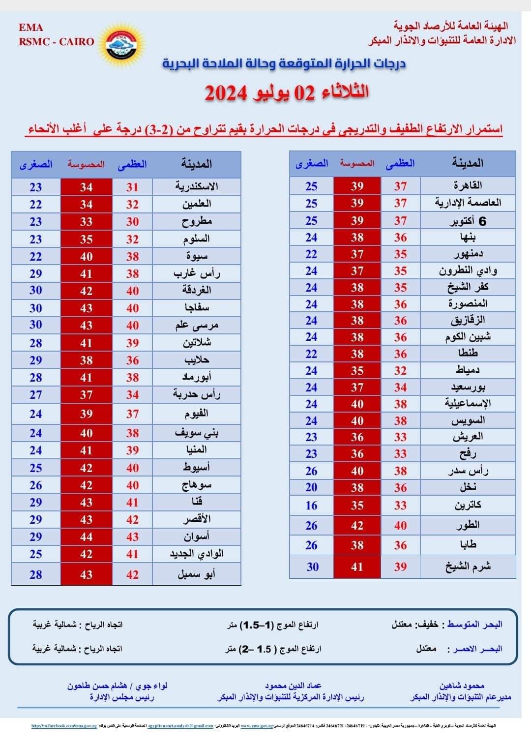 كشفت الهيئة العامة للأرصاد الجوية عن استمرار ارتفاع درجات الحرارة، غدٍ، الثلاثاء، بقيم تتراوح بين 2 إلى 3 درجات مئوية على شمال البلاد وحتى القاهرة الكبرى، ومن المقرر أن يسود طقس شديد الحرارة رطب نهارا على أغلب الأنحاء، حار رطب على السواحل الشمالية، شديد الحرارة على جنوب سيناء والصعيد.