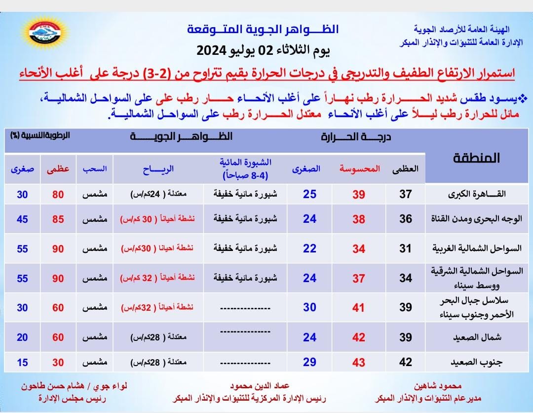 كشفت الهيئة العامة للأرصاد الجوية عبر صفحتها الرسمية بموقع فيسبوك عن استمرار الارتفاع الطفيف والتدريجي في درجات الحرارة على أغلب الأنحاء بقيم تتراوح بين (2-3) درجات حيث متوقع أن تسجل العظمى على القاهرة الكبرى اليوم 37 درجة.