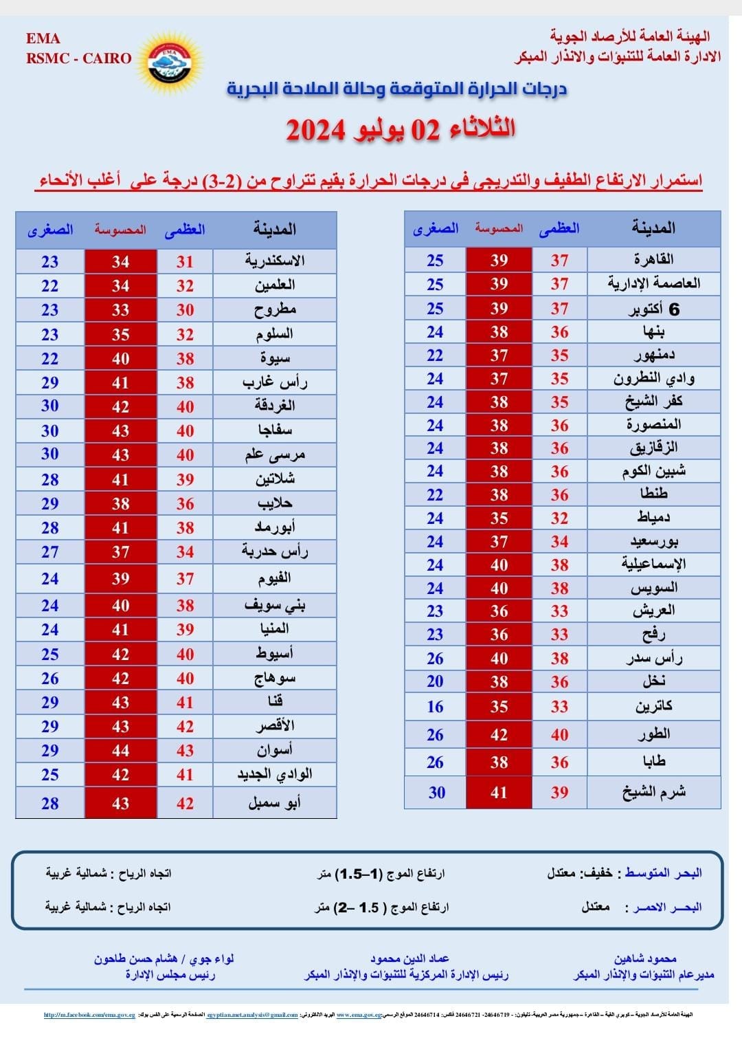 درجات الحرارة فى رأس سدر الصغرى 26 والعظمى 38