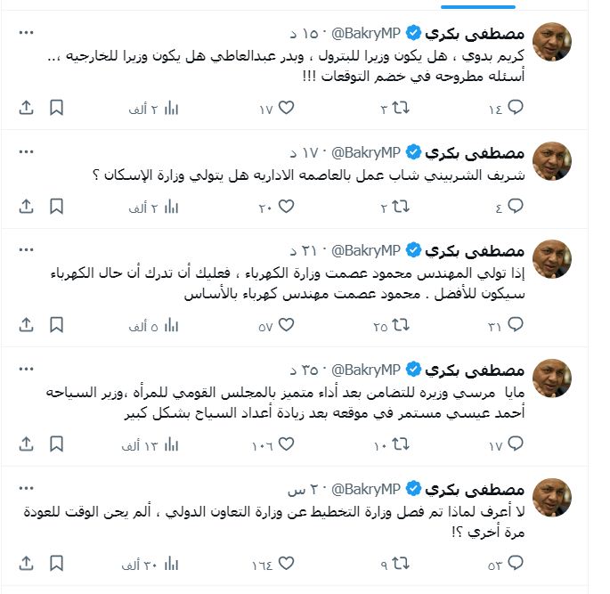 وكتب بكري سلسلة تدوينات له في صفحته الشخصية بموقع “إكس”، : “كريم بدوي، هل يكون وزيرًا للبترول، وبدر عبدالعاطي هل يكون وزيرا للخارجية، أسئلة مطروحة في خضم التوقعات”.