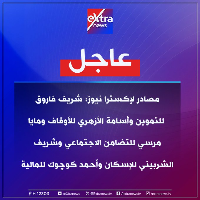 وفي تدوينة أخرى عبر موقع “إكس”، أعلنت اختيار شريف فاروق للتموين وأسامة الأزهري للأوقاف ومايا مرسي للتضامن الاجتماعي وشريف الشربيني للإسكان وأحمد كوجوك للمالية.