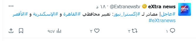 أفادت قناة “إكسترا نيوز” في نبأ عاجل لها عن مصدر مطلع لها تغيير محافظي القاهرة والإسكندرية والأقصر.