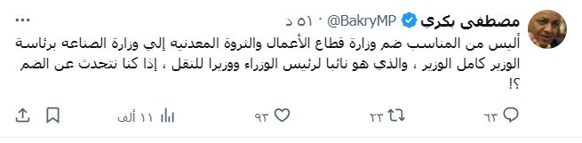 طالب الإعلامي مصطفى بكري، عضو مجلس النواب، بضم وزارة قطاع الأعمال والثروة المعدنية إلى وزارة الصناعة برئاسة الوزير كامل الوزير.