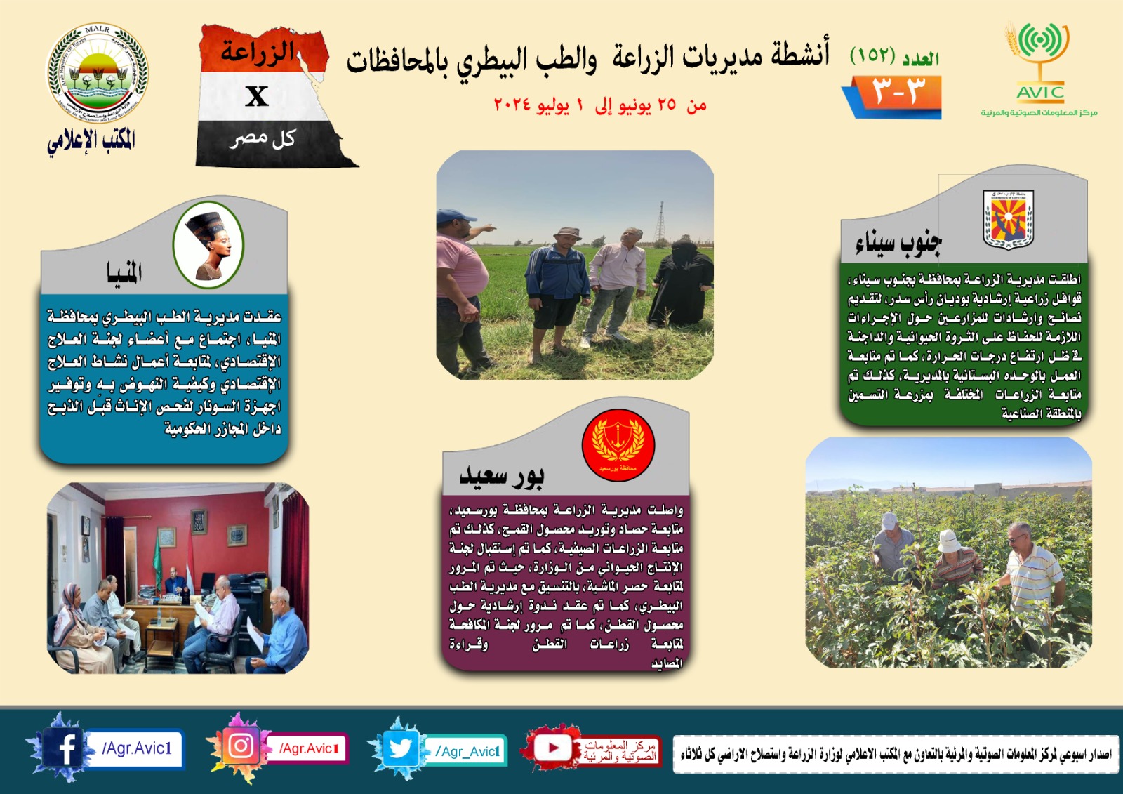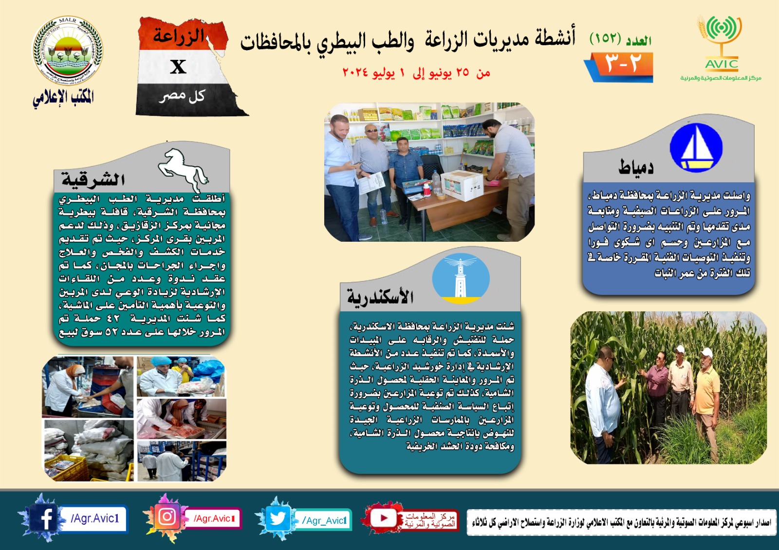 أصدر مركز المعلومات الصوتية والمرئية التابع لوزارة الزراعة واستصلاح الأراضي، والمكتب الاعلامي للوزارة، العدد رقم 152 من اصدار: "الزراعة في كل مصر" بالانفوجراف والفيديو، يوضح الجهود والانشطة التي تقوم بها مديريات الزراعة والطب البيطري بمحافظات الجمهورية خلال الفترة من 25 يونيو وحتى 1 يوليو الجاري.