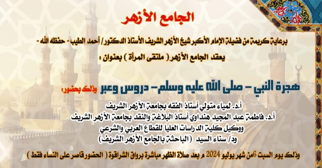وتأتي الندوة الثانية من البرنامج الخامس عشر بعنوان"الهجرة النبوية.. دروس وعبر"، ويحاضر فيها كل من؛ الدكتورة لمياء متولي، أستاذ الفقه بجامعة الأزهر والدكتورة فاطمة عبد المجيد هنداوي، أستاذ البلاغة والنقد بجامعة الأزهر ووكيل كلية الدرسات العليا للقطاع العربي والشرعي، وتدير الندوة الدكتورة سناء السيد الباحثة بالجامع الأزهر الشريف.