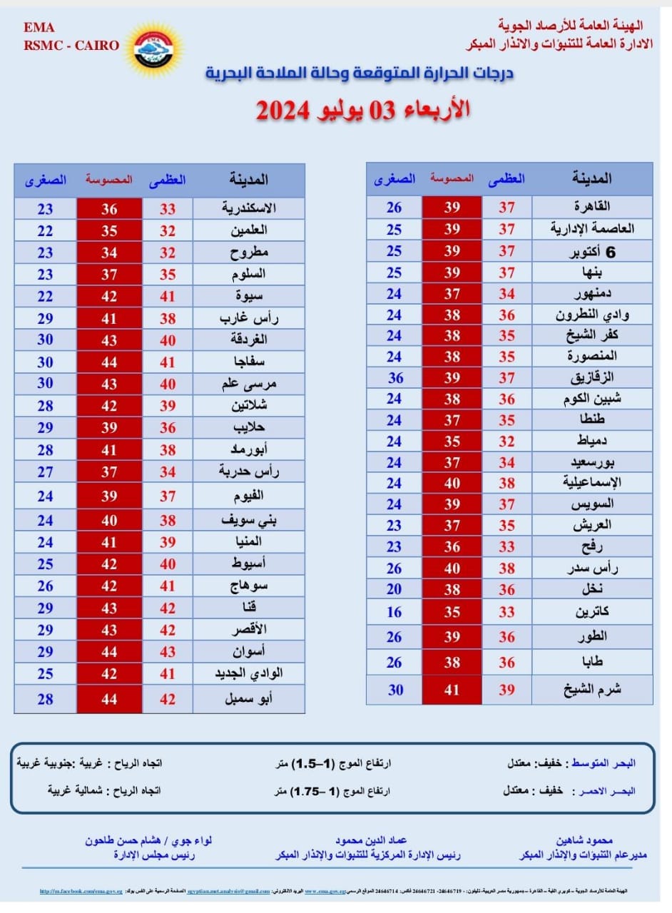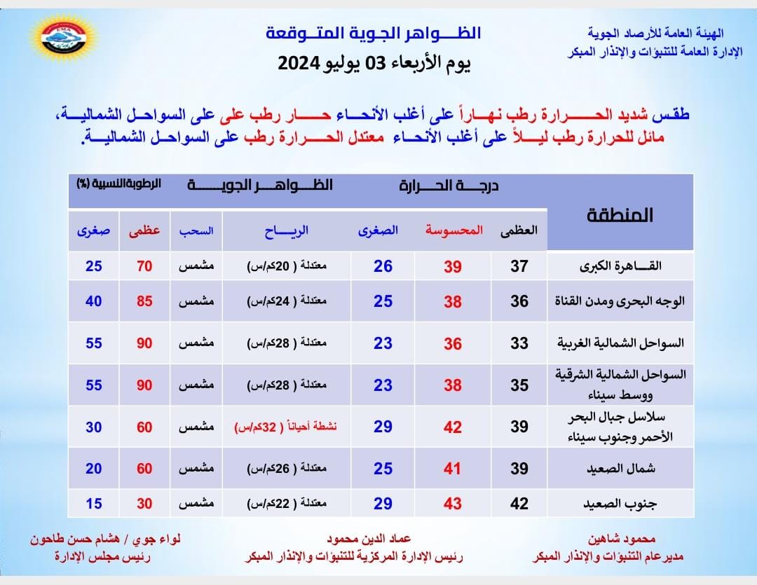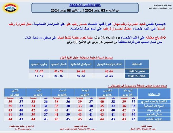 كشفت هيئة الأرصاد الجوية عبر صفحتها الرسمية على موقع فيسبوك توقعات حالة الطقس غدا الأربعاء الموافق 3 يوليو حيث سيشهد طقس شديد الحرارة رطب نهارا على أغلب الأنحاء ، حار رطب على السواحل الشمالية، مائل للحرارة رطب ليلاً على أغلب الأنحاء، معتدل الحرارة رطب على السواحل الشمالية.