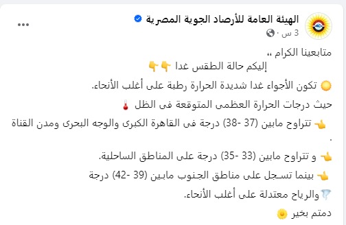 حذرت هيئة الأرصاد الجوية من طقس اليوم الأربعاء حيث ستكون الأجواء شديدة الحرارة رطبة على أغلب الأنحاء، إذ ستكون درجات الحرارة العظمى المتوقعة فى الظل، تتراوح ما بين (37 -38) درجة فى القاهرة الكبرى والوجه البحرى ومدن القناة.