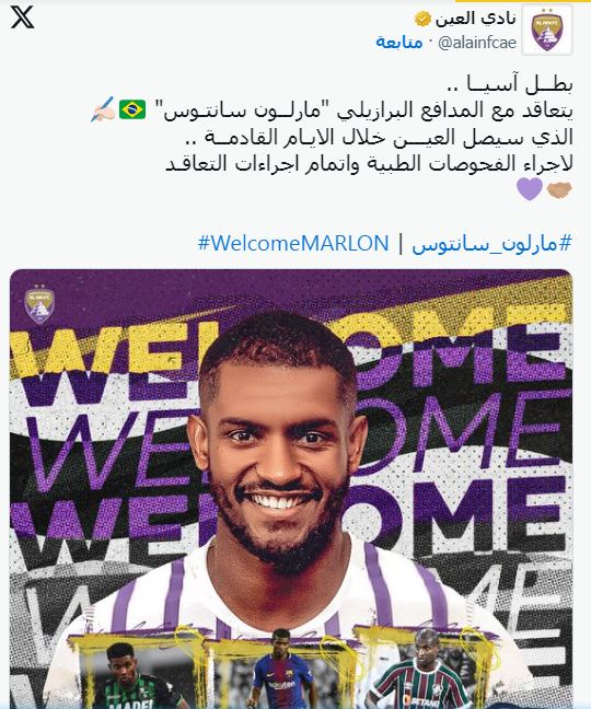 وفي نفس الإطار، نشر حساب العين الرسمي بيانًا أكد من خلاله تعاقده مع البرازيلي مارلون سانتوس، وكتب: "بطل آسيا يتعاقد مع المدافع البرازيلي مارلون سانتوس".
