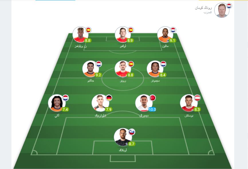 وجاء التشكيل المثالي لدور الـ 16 في البطولة القارية وفقا لوسائل الإعلام ليشهد تواجد 3 لاعبين من إسبانيا وأيضًا من هولندا، بينما يحضر منتخب ألمانيا صاحب الأرض بلاعب واحد فقط.