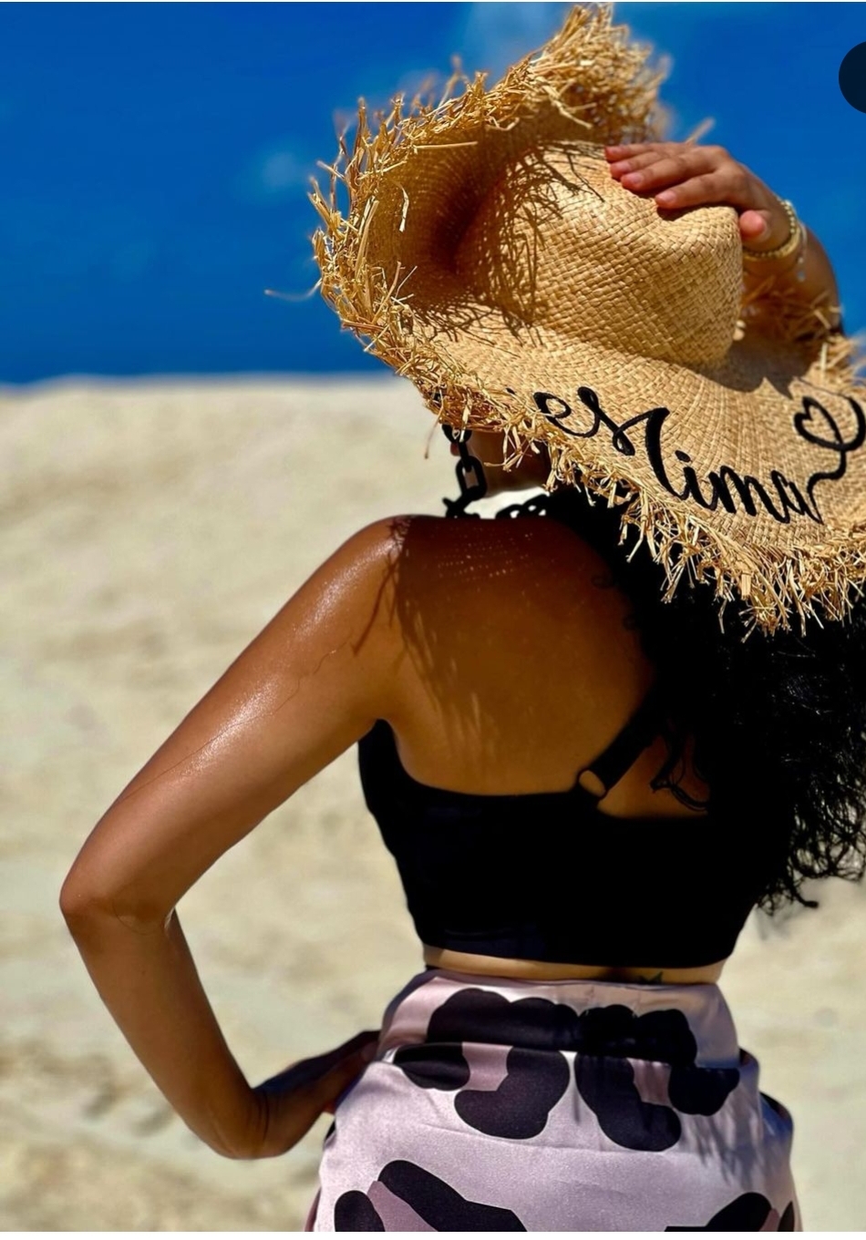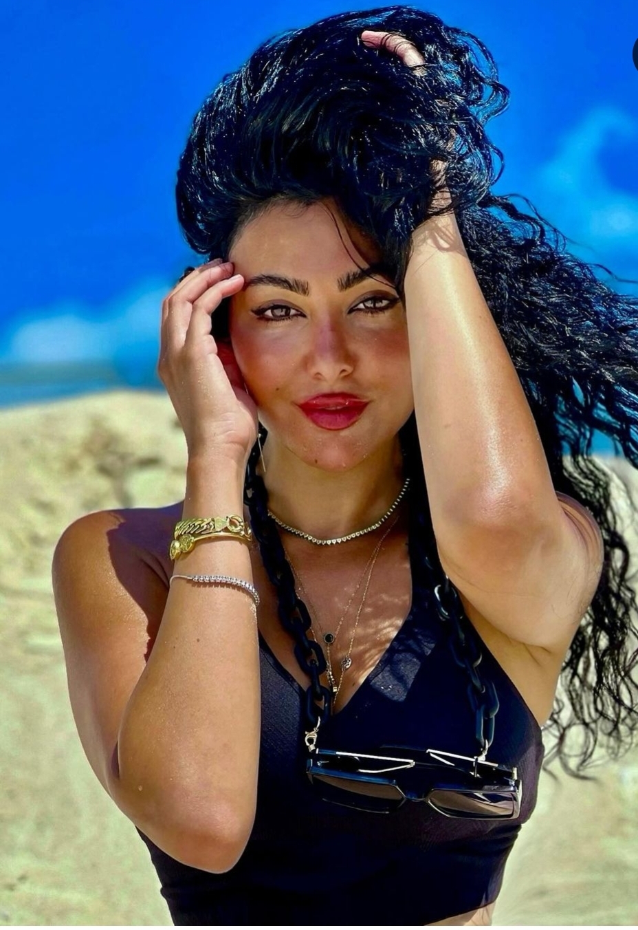 وبدت ميرهان حسين بإطلالة صيفية تميل للجرأة، حيث ارتدت بكيني مثير، واستعانت بميني جيب من الحرير لتكمل إطلالاتها على الشاطئ،   صمم البكيني من قماش ناعم باللون الأسود عكس قوامها الممشوق ووزنها المثالي، وتزينت ببعض الاكسسوارات العصرية.