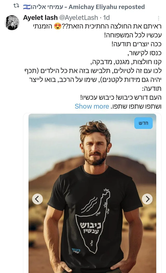وشملت التدوينة أيضًا رابطًا لموقع الكتروني يبيع هذه المنتجات ويدعو إلى توسيع الاحتلال الإسرائيلي ليشمل سيناء وجنوب لبنان والأردن، وأفادت صحيفة تايمز أوف إسرائيل بأن التغريدة الأصلية التي أعاد إلياهو نشرها جاء فيها “الشعب يطالب بالاحتلال الآن”.