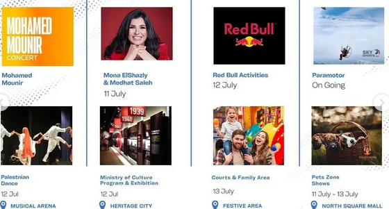 وعلى جانب الحفلات الغنائية التي ستصل لـ 10 حفلات، مع كبار نجوم الأغنية العربية، ومنهم “عمر خيرت، محمد منير، عمرو دياب، كاظم الساهر، محمد حماقي، تامر حسني، تامر عاشور، ديانا حداد، ويجز، كايروكي، سعاد ماسي ”.