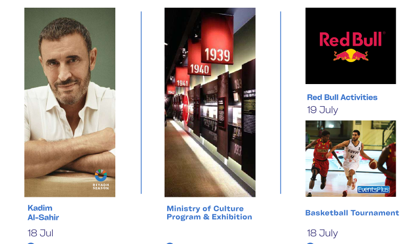 وعلى جانب الحفلات الغنائية التي ستصل لـ 10 حفلات، مع كبار نجوم الأغنية العربية، ومنهم “عمر خيرت، محمد منير، عمرو دياب، كاظم الساهر، محمد حماقي، تامر حسني، تامر عاشور، ديانا حداد، ويجز، كايروكي، سعاد ماسي ”.