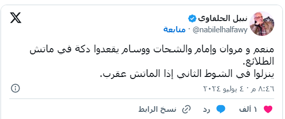 وكتب الحلفاوي، في تدوينة عبر حسابه قائلًا: "منعم ومروان وإمام والشحات ووسام يقعدوا دكة في ماتش الطلائع.. ينزلوا في الشوط الثاني إذا الماتش عقرب".