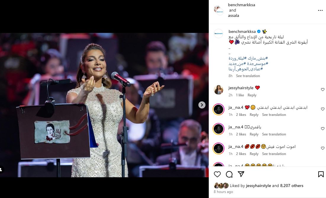أحيت النجمة أصالة حفل "ليلة وردة" ضمن فعاليات موسم جدة 2024، تحت شعار "من جديد"، تزامنا مع احتفال مدينة جدة بالنجمة الراحلة وردة الجزائرية في ليلة من ليالي الروائع برعاية الهيئة العامة للترفية اليوم 4 يوليو على عبادي الجوهر أرينا.