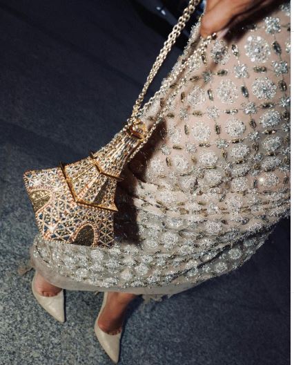 وأكلمت النجمة المصرية فخامة إطلالتها بحقيبة يد صممت على هيئة برج إيفل المرصع بحبات الكريستال الذهبي والفضي الشفاف.