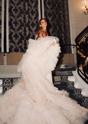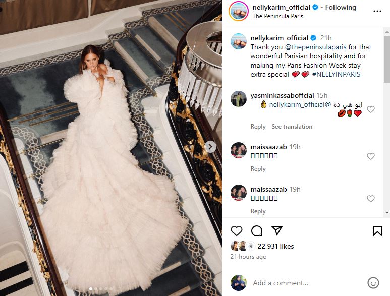 وخضعت نيللي كريم لجلسة تصوير جديدة على خطى عارضات الأزياء العالميات بلمسة سحر مصرية خاصة بها، حيث ارتدت فستان طويل مجسم، بدون أكمام، مكشوف الظهر، صمم من قماش التل المطرز بالكامل بحبات الألماس مع اللؤلؤ وأكملت فخامة إطلالتها بكاب صمم من التل بطبقات الداربية لتشبه الزهرة في بستان الزهور بأسلوب عصري يتناغم مع ذوق ورقي المجتمع الفرنسي المفعم بالسحر والجمال للعالم أجمع.