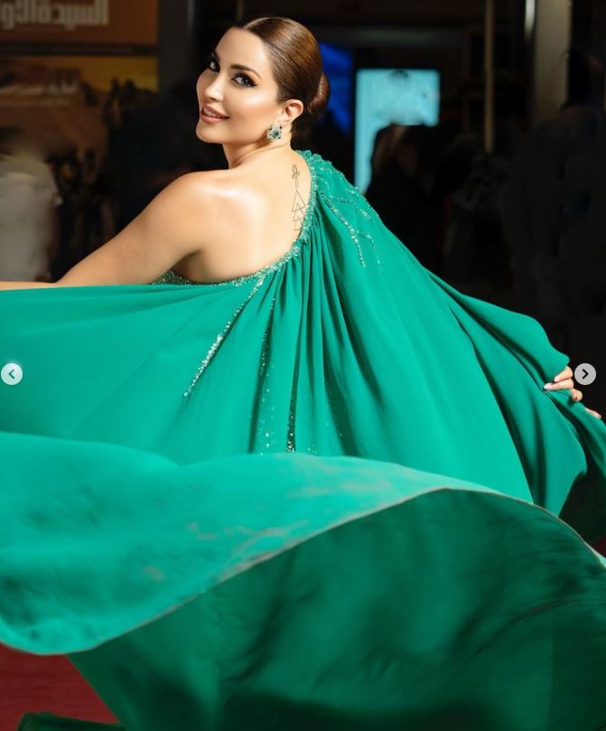 وبدت نسرين طافش بإطلالة ساحرة، مفعمة بالأنوثة والجاذبية في آن واحد، بلمسة تواكب أحدث صيحات موضة بتصاميم فساتين السهرة ربيع وصيف 2024، حيث أرتدت فستان طويل مجسم، ينتمي لقصة ألوان شولدر، مكشوف الظهر كشف عن تاتو مفتاح الحياة رمز الحضارة الفرعونية الكامن في ظهرها، صمم الفستان من قماش الشك المطرز بحبات الخرز الصغير بنفس لون الفستان الأخضر الزاهي وزود بكاب حرير طرز أيضا ببعض حبات الخرز الراقي، الفستان حمل توقيع Mambo، وتزينت ببعض المجوهرات المرصعه بحبات الألماس مع الأحجار الكريمة.
