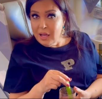 وظهرت فيفي عبده وهي تحمل مشروب يشبه عصير الطماطم وعلقت: "عاجل من الطيارة، اسكوز مي يا جماعة حبيت اتفزلك افتكرته عصير طماطم بس طلع بلادي ميري أو ماي جاد الحمد لله طلع من غير كحول".