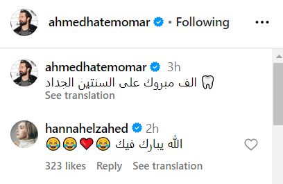 وعلق أحمد على الصورة قائلا: "ألف مبرووك على السنتين الجداد" ، وذلك لأن هنا الزاهد خضعت مؤخرا لعملية تجميل في أسنانها بسبب التنمر التي تعرضت له دائما.