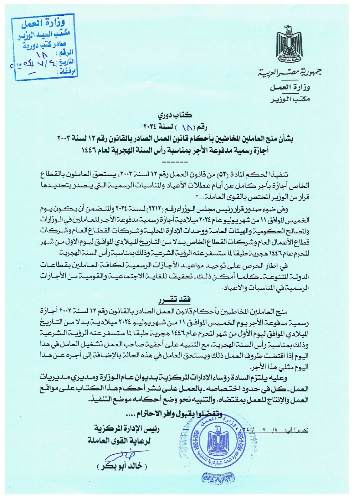 وكان رئيس مجلس الوزراء أصدر القرار رقم 2213، لعام 2024، بأن يكون يوم الخميس الموافق 11 يوليو عام 2024، إجازة رسمية مدفوعة الأجر للعاملين في الوزارات والمصالح الحكومية، والهيئات العامة ووحدات الإدارات المحلية وشركات القطاع العام وشركات قطاع الأعمال العام، وشركات القطاع الخاص، وذلك بدلا من التاريخ الميلادي الموافق ليوم الأول من شهر المحرم عام 1446 هجرية، طبقا لما ستسفر عنه الرؤية الشرعية بمناسبة رأس السنة الهجرية.