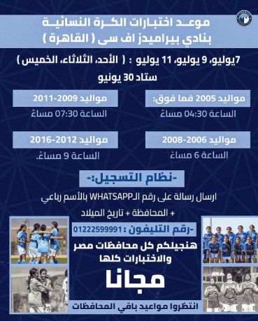 بيراميدز يعلن مواعيد اختبارات الكرة النسائية مجاناً