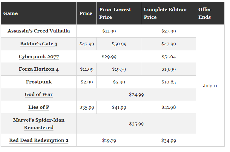 ومن بين مئات الصفقات المقدمة كجزء من العرض الترويجي، حصلت خمس ألعاب حائزة على جوائز على خصومات غير مسبوقة؛ Marvel's Spider-Man Remastered Lies of P، Forza Horizon 4، Frostpunk، وBaldur's Gate 3 كلها متاحة حاليًا بأقل أسعارها على الإطلاق. تعد لعبة Frostpunk لبناء مدينة البقاء على قيد الحياة من إنتاج 11 Bit Studios هي الأرخص من بين هذه المجموعة، حيث يبلغ سعرها مؤقتًا 2.99 دولارًا أمريكيًا فقط، أو 10.65 دولارًا أمريكيًا لأولئك الذين يرغبون في الحصول على إصدار Game of the Year Edition الكامل للمحتوى.
