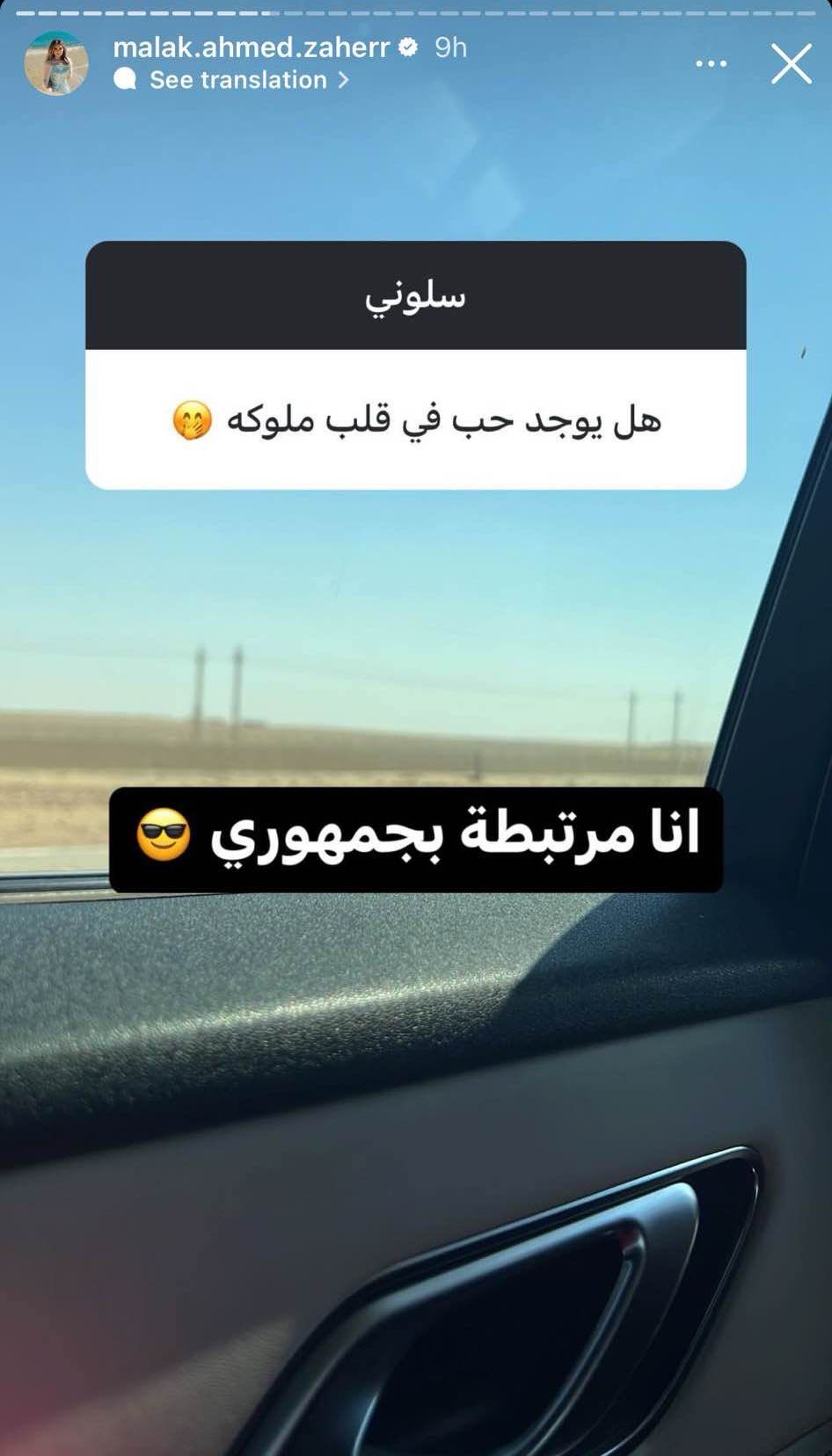 وفتحت ملك زاهر باب التساؤلات عبر الحالة الخاصة بها على “إنستجرام”، لتتقرب أكثر من متابعيها، وكانت من أكثر التساؤلات تكرارًا عن حقيقة إرتباطها، فكتب متابع: "هل يوجد حب في قلب ملوكة"، لتجيب: "أنا مرتبطة بجمهوري"، وفي سؤال آخر قيل: "امتى نفرح بيكي زي ليلى"، لترد: "ما تفرحوا بيا دلوقتي، هو أنا لازم أجيب فرد إيضافي عشان تفرحوا بيا.. افرحوا بيا لوحدي.. عامًة أول ما ألاقي ابن الحلال هقول لكم فورًا".
