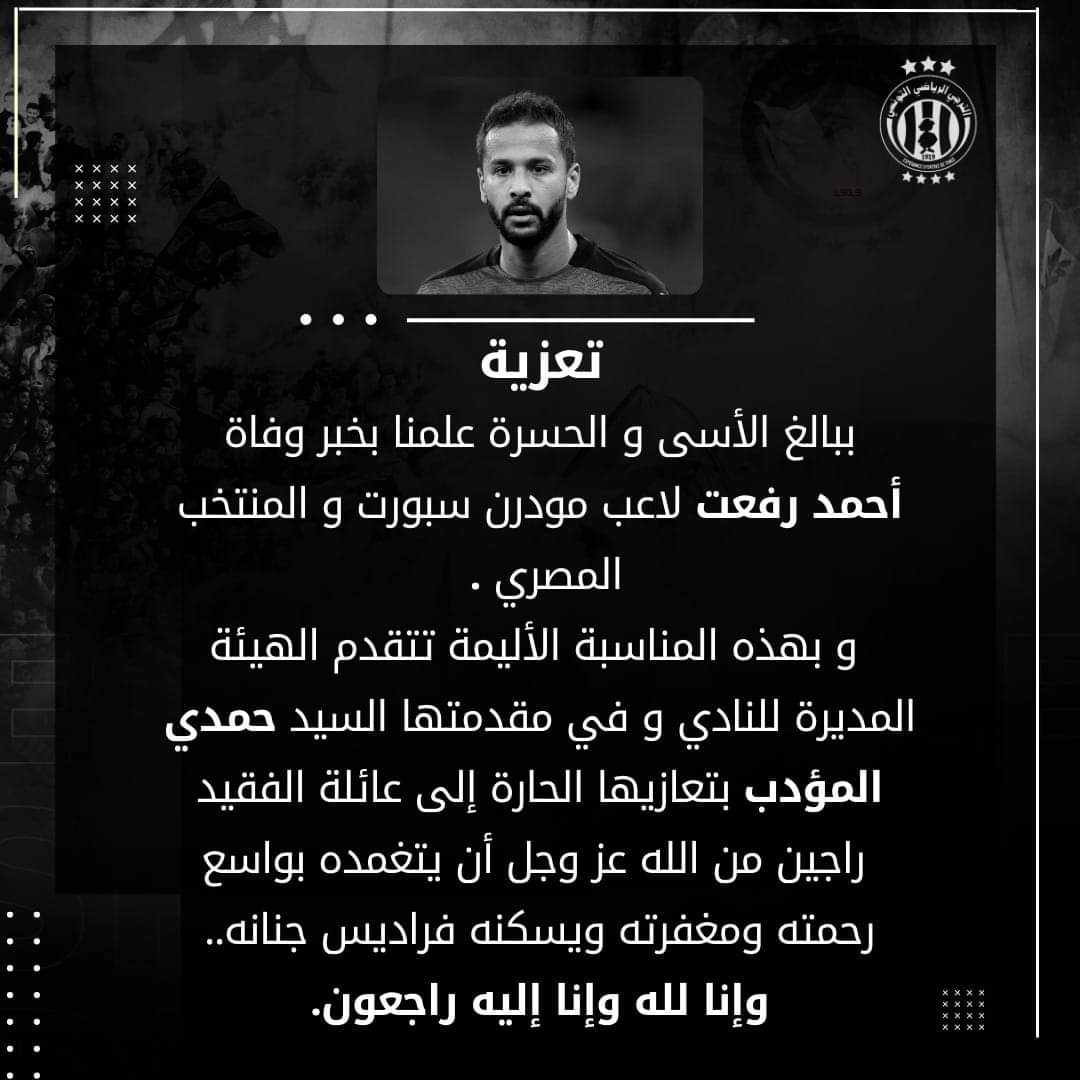 تقدم مجلس إدارة نادي الترجي الرياضي التونسي بصادق العزاء الى اسرة اللاعب الشاب احمد رفعت والذي توفاه الله امس السبت عن عمر ناهز 31 عام بعد فتره صراع مع المرض بدأت منذ شهر مارس الماضي.