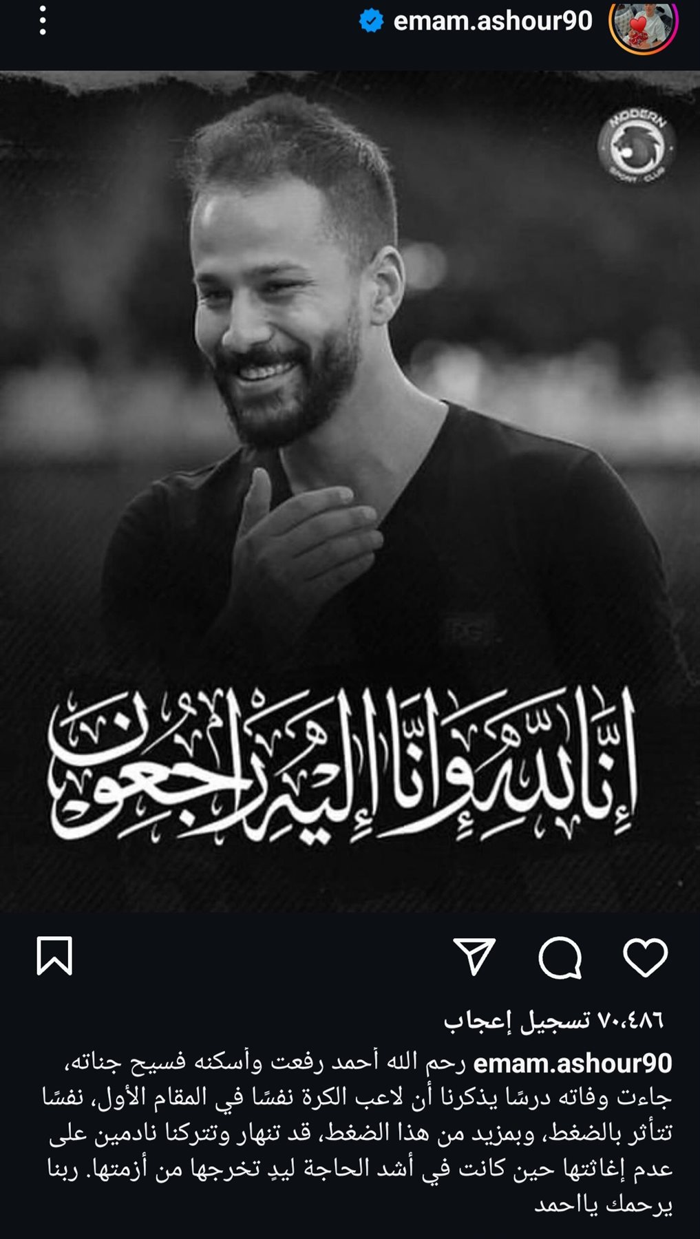 وكتب لاعب الاهلي عبر حسابه الشخصي على موقع التواصل الاجتماعي انستجرام : "رحم الله أحمد رفعت وأسكنه فسيح جناته، جاءت وفاته درسًا يذكرنا أن لاعب الكرة نفسًا في المقام الأول، نفسًا تتأثر بالضغط، وبمزيد من هذا الضغط، قد تنهار وتتركنا نادمين على عدم إغاثتها حين كانت في أشد الحاجة ليدٍ تخرجها من أزمتها. ربنا يرحمك يااحمد".