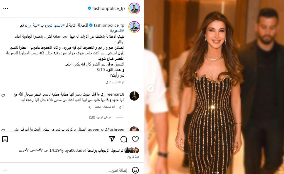 وجاء تعليق إيلي حنا عبر الصفحة الرسمية لشرطة الموضة بالإنستجرام، مؤيد لها قائلًا: "الإطلالة الثانية ل نانسي عجرم ب ليلة وردة في السعودية، هيدي الاطلالة بتختلف عن الاولى انه في Glamour اكتر... بتحسوا الجاذبية اعلى بهاللوك".