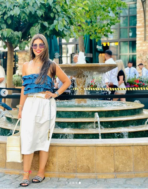 وبدت منة فضالي بإطلالة صيفية مبهجة مستوحاه من زهرة بلو ستار المفعمة باللون الأزرق، حيث ارتدت توب جذاب صمم على طريقة الدرابية ونسقت عليه جيب قصيرة صممت من قماش ناعم باللون الأبيض وزينتها بحزام ذهبي حول خصرها، فيما انتعلت سليبر.