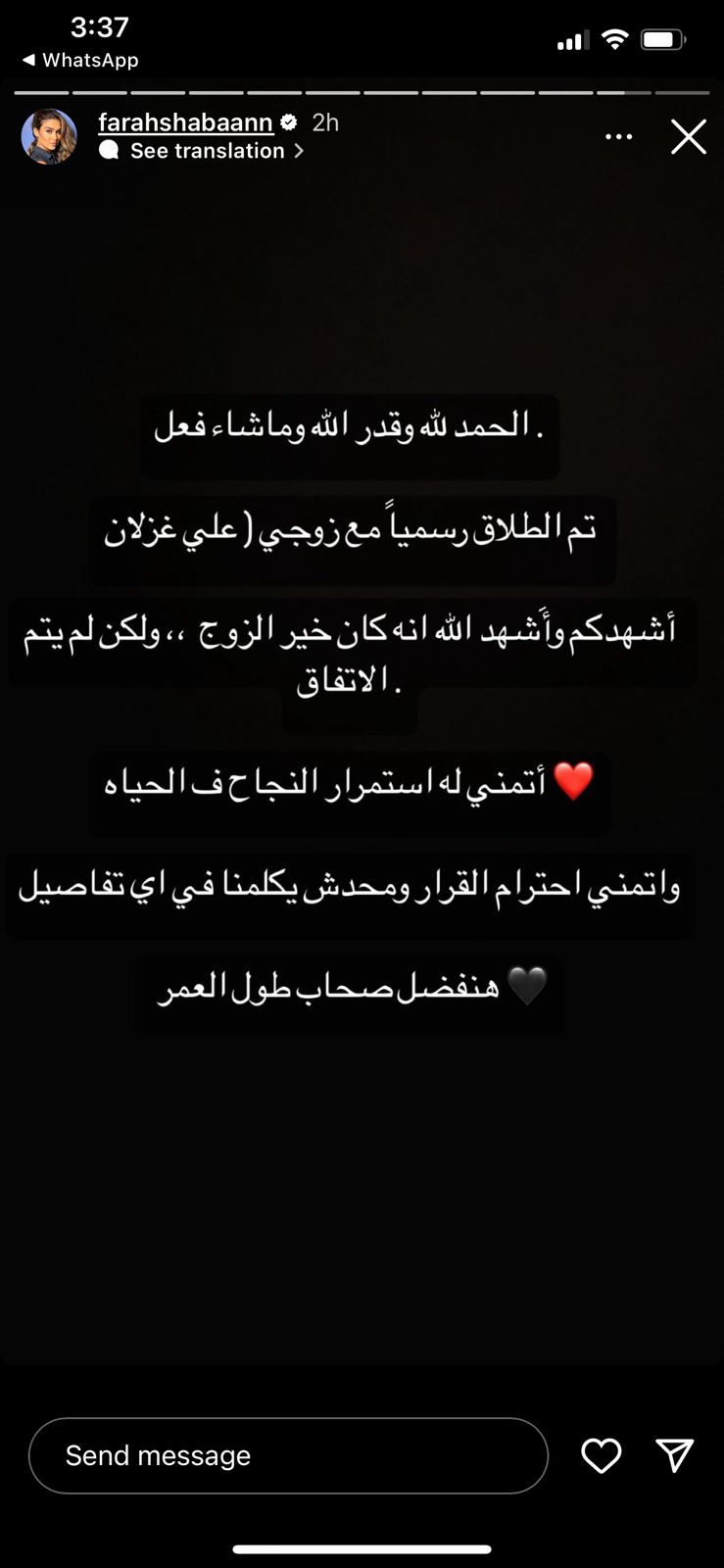 شاركت الإعلامية وملكة جمال مصر فرح شعبان، والبلوجر علي غزلان نبأ طلاقهما عبر خاصية الاستوري في موقع تبادل الصور والفيديوهات إنستجرام، حيث قال طليقها : الحمد لله وقدر الله وما شاء فعل، تم الانفصال رسميًا مع زوجتي فرح شعبان، أشهدكم وأَشهد الله أنها كانت خير الزوجة، ولكن لم يتم الاتفاق.