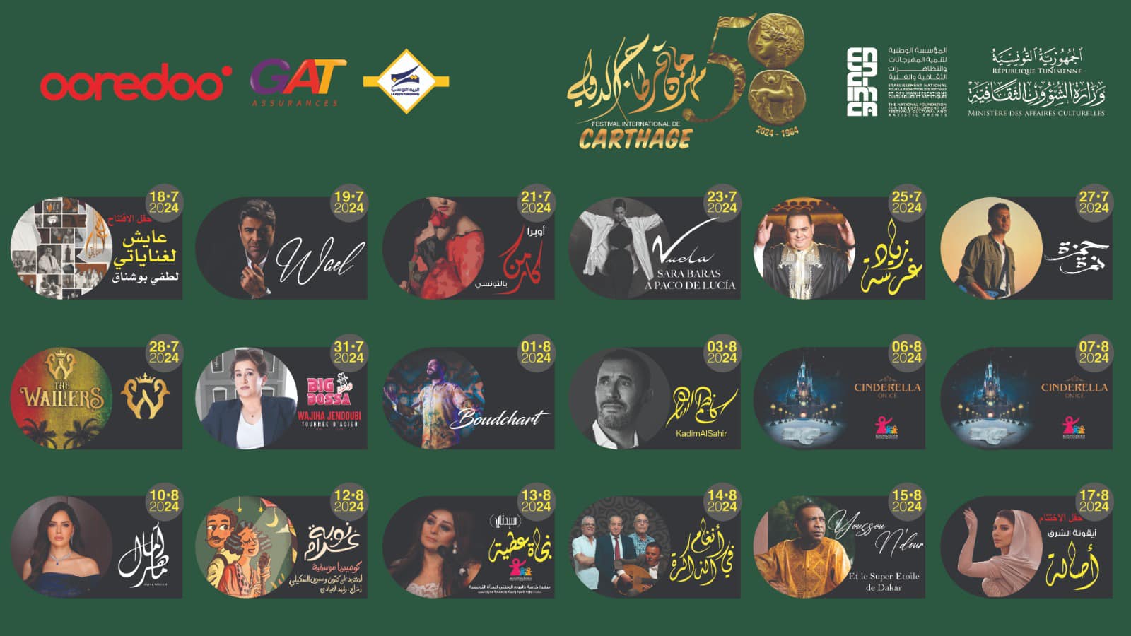أطلقت إدارة مهرجان قرطاج الدولي البوستر الرسمي للدورة الـ58، والتي تضم نخبة من نجوم الغناء العربي، وعددًا من العروض الثقافية والتراثية لـ تونس الخضراء.