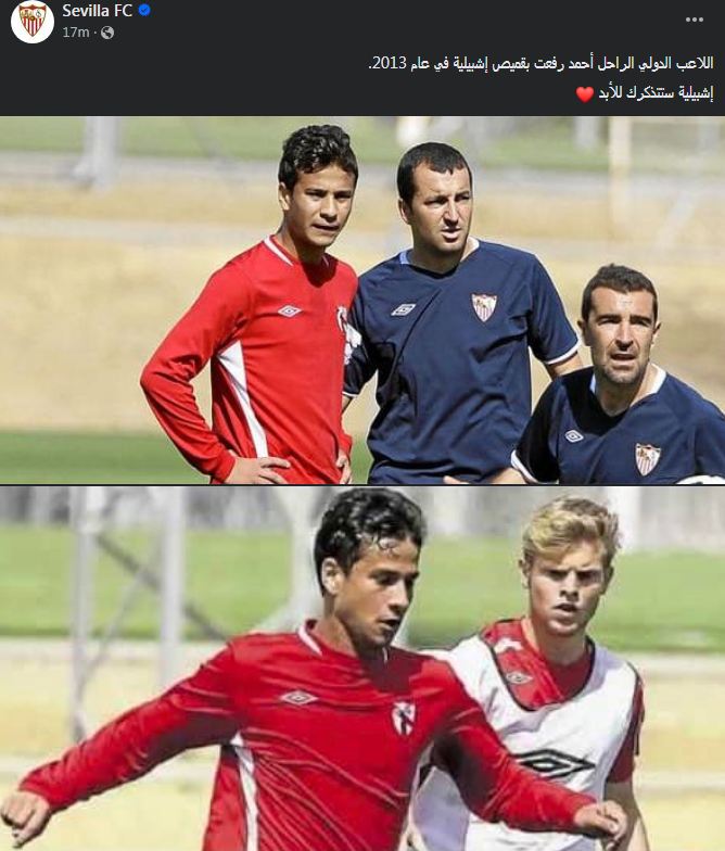 نشر نادي أشبيلية الأسباني صورًا للراحل أحمد رفعت بقميص النادي في إحدى تدريبات الفريق ترجع إلى عام 2013 ،